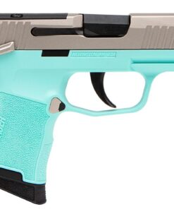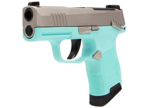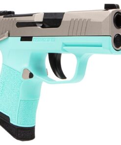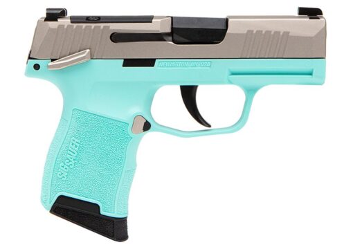 Mit ihrem edelstahlfarbenen Schlitten, den vernickelten Bedienelementen (Magazinauslöser, Verschlussfanghebel, Zerlegehebel) und dem markanten Griffstück in Robin’s Egg Blue ist diese P365-Variante ein echter Blickfang – ohne Kompromisse bei der Leistung.